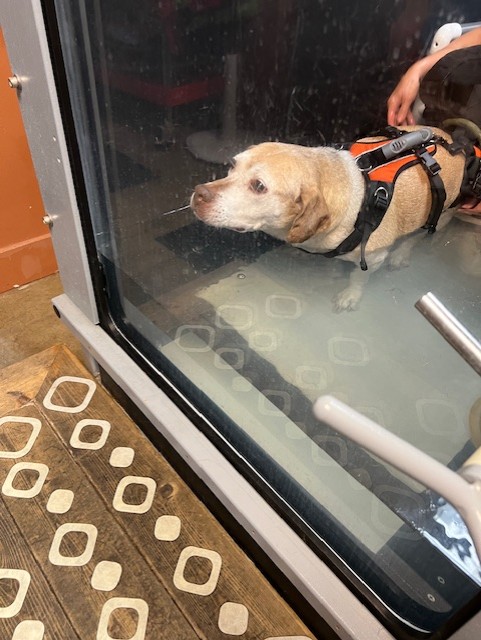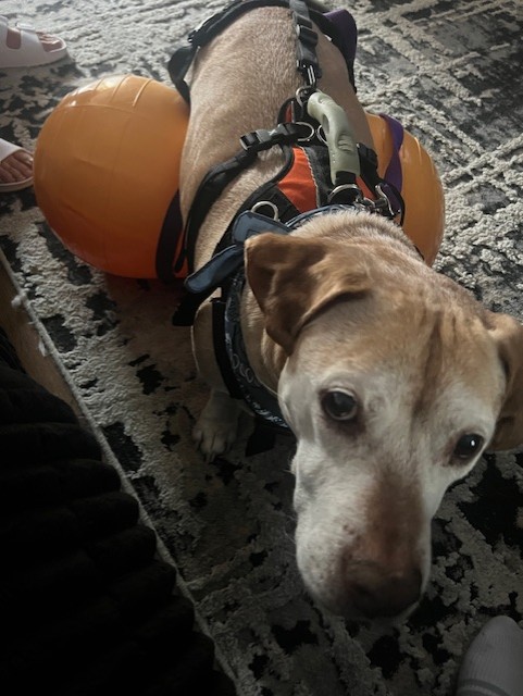A few years ago Dutchess had an injury to her spine. At the time it was recommended that surgery was not a good option for her. We managed her pain and tried to heal her as best we could. Recently age has been sneaking up on her, rendering her back legs very weak. She lost a lot of mobility. I was recommended to VSMR by our primary vet. We had her in intensive therapy for a while, hydro, laser, and acupuncture.